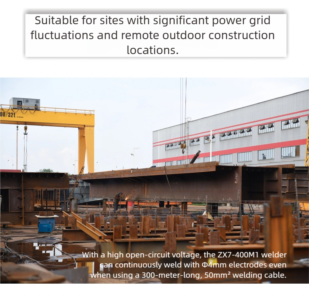 Power Conditions: Stable welding even with fluctuating grids or 300 m / 50 mm² cable runs (ZX7-400M1 + Φ4 mm electrode)